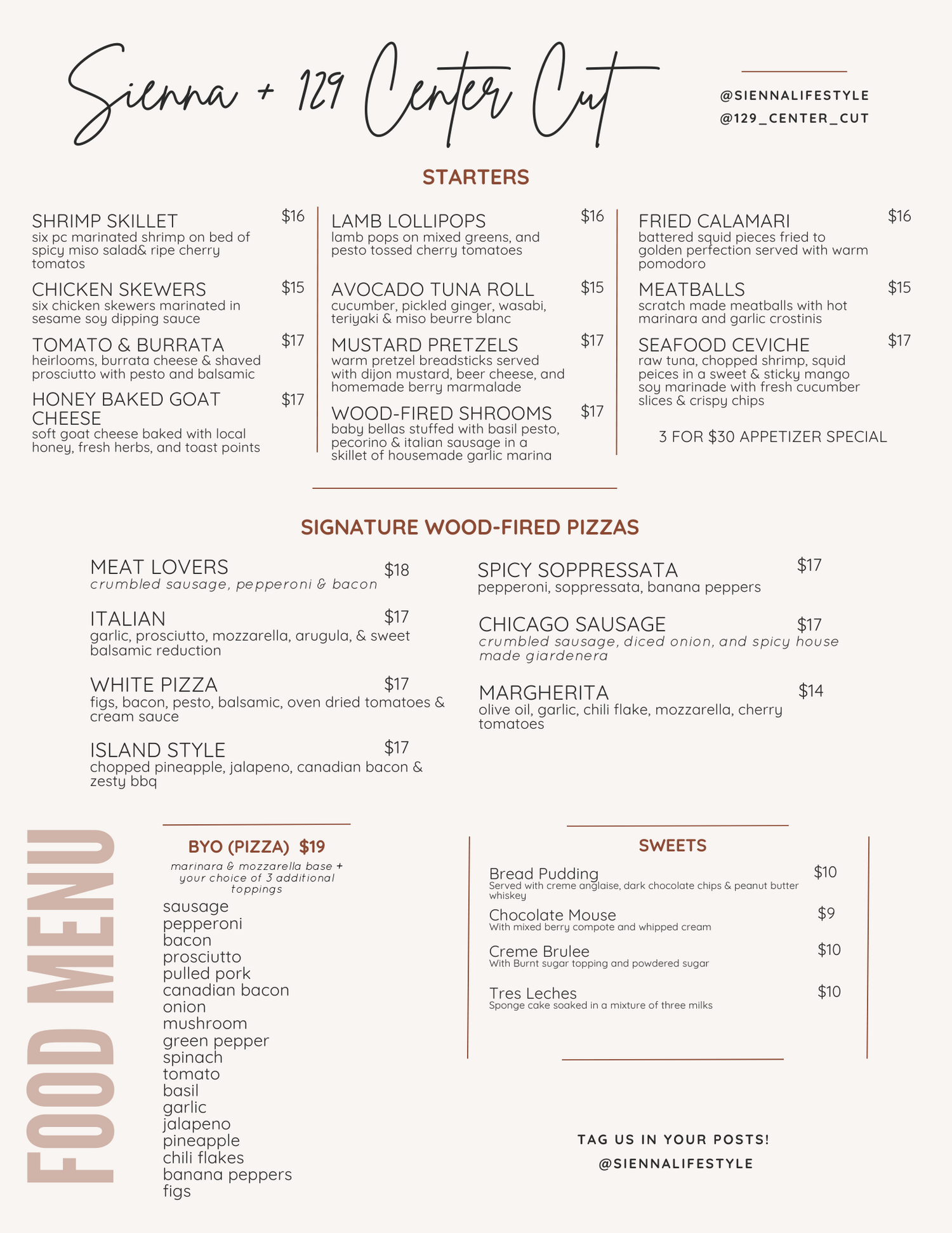 Center Cut has been serving community favorites since 2016! We are so excited to have Center Cut's appetizers, wood fire pizzas and desserts available to order at Sienna Lifestyle while you sip & shop!